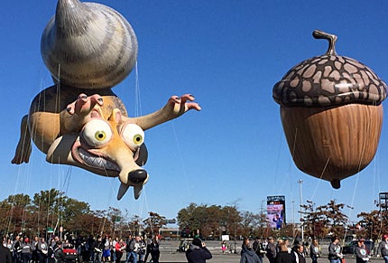 Pint-sized moviegoers have grown accustomed to watching Scrat chase his acorn in Ice Age, but the squirrel has his work cut out for him as his chase must now include navigating parade crowds and Manhattan city streets! To give you an idea of scale, Scrat's helium acorn would require 15 million real-lie acorns to fill its volume.