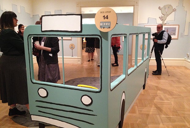 The "pigeon bus" serves as a mid-gallery reading nook, stocked with Willems books. Photo by the author.