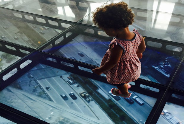 One more quick escalator ride takes you to the main observatory on the 100th floor. Here you'll find the Sky Portal, which was a huge draw for my fearless toddler, though some tourists were freaked out by the experience, meant to make you feel as if only a sheet of glass and steel girders separate you from the city below. In reality, you're standing on an HD video screen playing a real-time feed of the streets so there are still 100 floors between you and the earth.