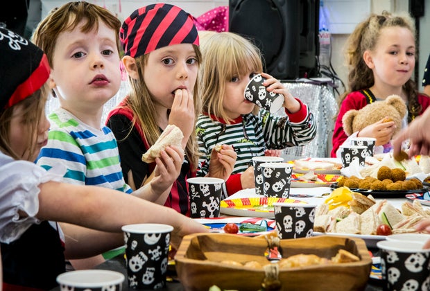Activities: Put out arts and craft supplies, including long foam pieces, so kids can create their own swords and eyepatches (make sure there's an adult around to help with the fitting). Have kids walk the plank—set out cardboard "plank" and let them jump into a foam pit or baby pool. Kids can also create their own pirate names, do a backyard treasure hunt, and play capture the (pirate) flag!