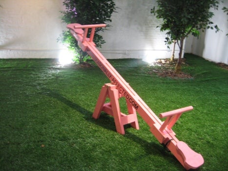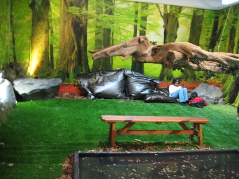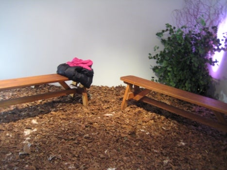 The park is actually three different rooms, the first is the smallest with a bona fide wood picnic table in the corner nestled among the trees and bushes.  Downstairs is a large room with skylights in its super high ceiling, another park bench, a lawn for sitting among the trees and a bright pink teeter totter.  Off this room is the “back” room, which is the most crowded, but also the most interesting.  This room has realistic photo murals on the walls to give the illusion that you are in a forest, a pond (full of coins from wishers), giant rocks and huge black and silver fat boys cushions to lounge on.  This room also has a small alcove with a wood chip floor and park bench seating.  I saw adults reading, picnicking and chatting as well as a toddler exploring the place.