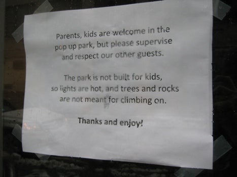 During Tuesday's freezing rain, sleet, snow and ice storm, I left my warm and cozy (well, overheated and small) apartment to check out park here, the indoor temporary pop up park created in a gallery space on Mulberry Street that I have been reading about everywhere.  Is it worth dragging the kids out in this weather?  Read on to find out.