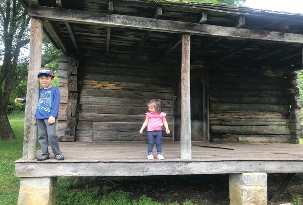 These kids are exploring a historic cabin in the Shenandoah National Park, but you can stay in a more modern one at Bear's Den.