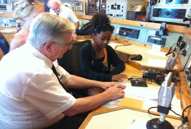 One treat we discovered is that on some days, amateur HAM radio operators set up in the ship's radio room and offer a history lesson on how the ship's radio used to function. The volunteers are a wealth of information and finish up by teaching kids to tap out their own names in Morse code on the ship's transmitter. Every kid takes home a page with the Morse code alphabet.