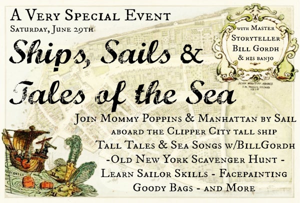 This cruise is sold out. Don't worry: Mommy Poppins will host other exciting events soon! Taking a cruise on New York Harbor is one of our favorite summer activities in NYC. That's why we here at Mommy Poppins are excited to invite you and your kids to a very special event we're planning: Ships, Sails and Tales of the Sea with Bill Gordh & Manhattan by Sail. On Saturday, June 29 join us as we set sail back in time aboard the historic Clipper City Tall Ship on a 90-minute excursion with family activities by master storyteller Bill Gordh, a scavenger hunt by New-York Historical Society's DiMenna Children's History Museum and more.
