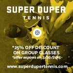 Super Duper Tennis is offering a 25% discount on spring group classes at various downtown locations. Offer is valid for one-time use for children ages 3 to 10 and cannot be used on previous orders or with any other codes. Valid for group classes only. Offer expires March 20, 2015.