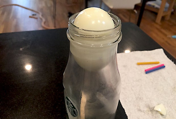 Pro tip: Rub butter on the egg to help it slide into the bottle.