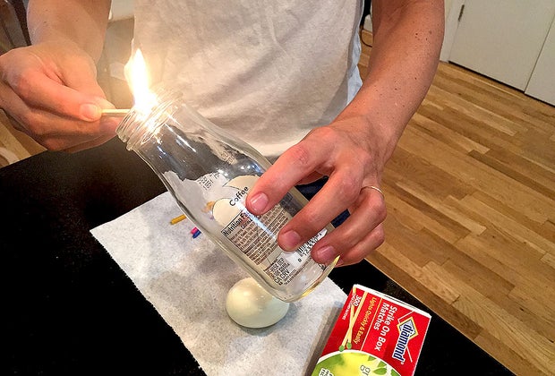 Now sit back...and watch! After the matches extinguish, the egg should start squeezing all the way into the bottle.