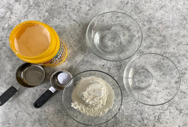 Measure out 1 cup of water into one small bowl and 1-2 cups of cornstarch in another bowl. You can add a few drops of food coloring if you'd prefer a colorful Oobleck. Maybe Seussian green?