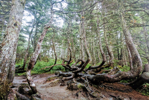These wind-swept trees are found on the easy Mount Roberts trail.
