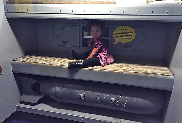 1. The Exploreum: If your kid isn't a full-on history nerd, this section of the Hangar Deck (the main exhibition space) is the most kid-friendly spot on board. This interactive space lets kids climb into a cockpit, pose as the pilot of a small helicopter, explore a submarine's tiny quarters, or fold up like a pretzel to squeeze into a space capsule. There are plenty of kid-friendly buttons to push, steering wheels to twirl, and more.