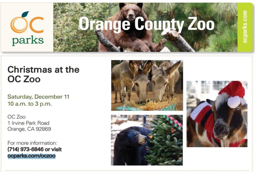 Activities include kids holiday crafts, a photo area, games, and visits with Santa and Mrs. Claus. The zoo animals get their presents early, receiving treats hidden inside Christmas trees and gift boxes.