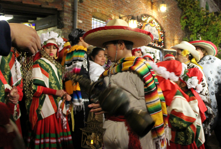 A reenactment of Mary and Joseph's search for a room at the inn is presented by the Olvera Street merchants, their families, and friends. Visitors are encouraged to join the nightly candlelight processions and Christmas carol singing in Spanish and English.