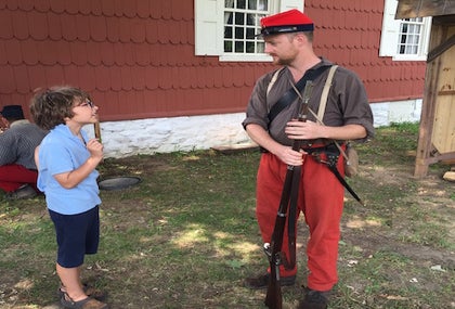 My son, learning all about Civil War weaponry at Old Bethpage Village Restoration. Photo courtesy of the author.