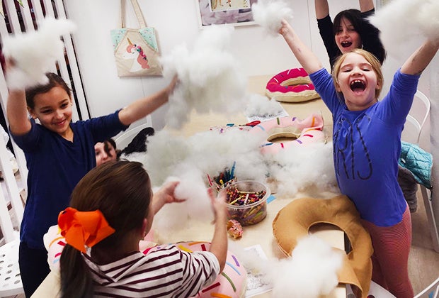 After young children have danced, played with the Lego table, slide, and interactive general store, the sweetest DIY project of all is unveiled: They get to make their own ice-cream sundaes. DIY add-ons include a stuff-a-pet activity. Packages begin at $425 for 11 children.