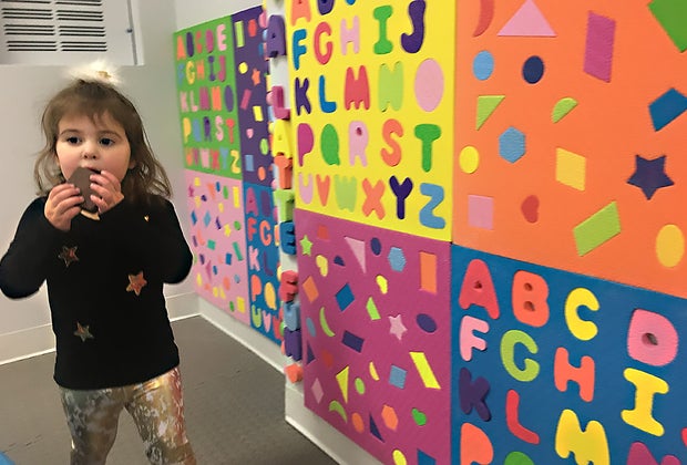 Singing her ABCs, this young learner enjoys the foam alphabet wall at A Latte Fun. Photo by the author