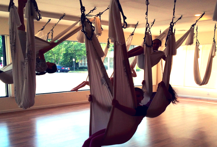 The kids-focused yoga classes are aimed at building confidence and conditioning. Regular mat yoga classes are offered weekly for ages 5-9, grown up and me classes are offered weekly for infants through 2.5 years old. Anti-Gravity kids classes for ages 6 and up focus on swinging, stretching, balancing and strengthening core muscles–all while hanging from the ceiling.