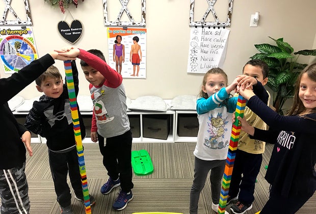 Students love the challenge of building and counting as high as they can at Little Linguals in Massapequa.