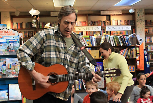 Guitarist Jeff Sorg adds a musical touch to storytime with singing and dancing for children and families at Book Revue in Huntington. Photo by AnnaLee Barclay