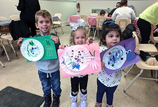 Children show off their shimmering crafts after listening to stories at Long Island Maritime Museum’s storytime in West Sayville. Photo courtesy of Long Island Maritime Museum