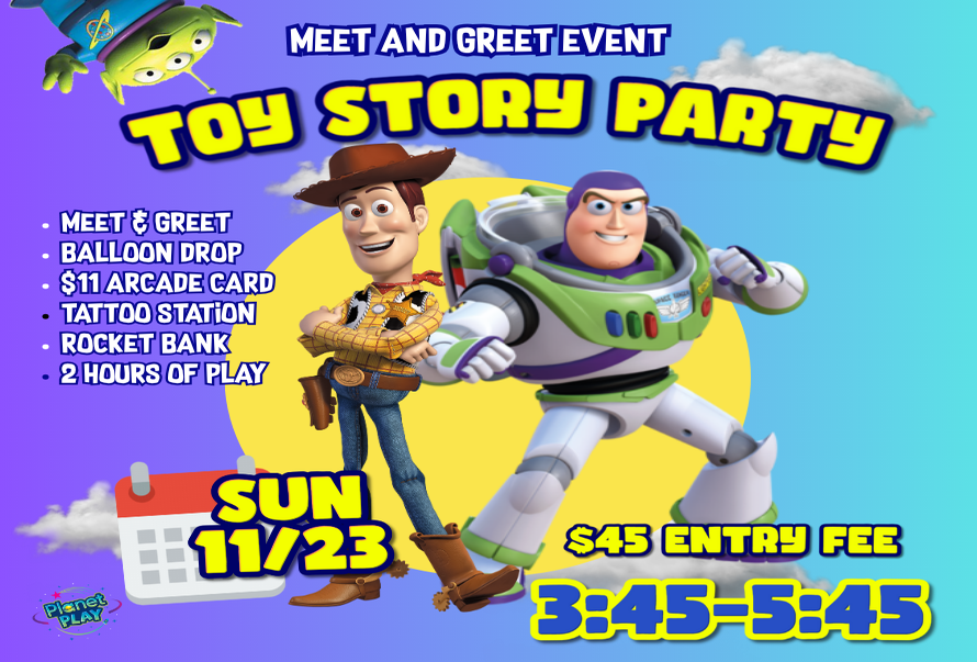 You've got a friend in fun with this Toy Story themed party that's blasting off at Planet Play. Enjoy two hours of open play, bouncing, arcade games, a jungle gym, and more.