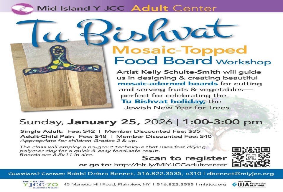 Join artist Kelly Schulte-Smith for a hands-on workshop designing and creating your own mosaic-adorned board for cutting and serving fruits and vegetables in celebration of Tu Bishvat. Using a no-grout technique with fast-drying polymer clay, you’ll create a food-safe, beautiful board—perfect for all skill levels.