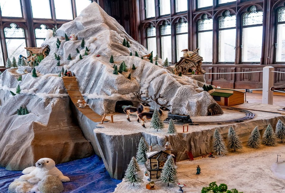 Watch the tiny train wind through a snow-dusted mountain scene, adding a magical new layer to the holiday wonder inside Hempstead House at the Sands Point Preserve.