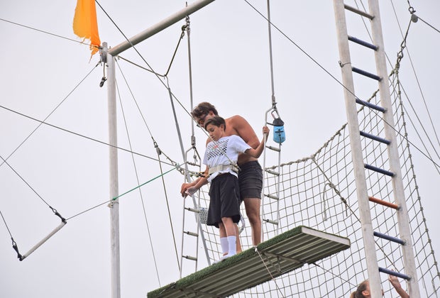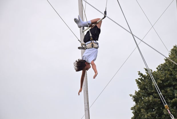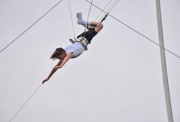 Surprisingly, there is no experience necessary for the trapeze. However, if you have back or shoulder issues be advised this is a highly physical activity. After being outfitted with a safety belt and a explanation of some trapeze jargon and a demonstration of basic maneuvers, my 10-year-old son and I felt semi-confident. Of course, that was with our feet planted safely below the 32-foot-high metal rig. The ascent involved ladder climbing before being hooked up to wired harnesses on a platform by an experienced trapeze artist. After chalking your hands like the pros do, dangle your tippy toes off the platform, reach for the trapeze bar and leap — gulp! Don't worry, there is a super soft cargo net below.