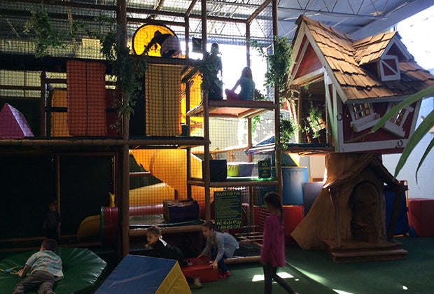At the tail end of the room you'll find the space's main attraction: a multi-level jungle gym that allows kids to stretch their limbs, challenge themselves to climb higher, and exert some of that pent-up energy that seems so difficult to release when park weather is still months away. Most of the play equipment, which is padded and protected up high by a sturdy gate, is okay for older toddlers and up, but you may need to trail your young child in order to keep him away from the long, twisty slide, which could prove too scary for little ones.