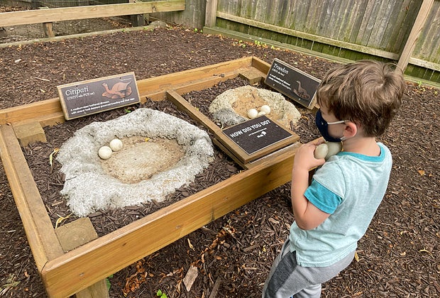 Outside, find more live animals, including peafowl, emus, goats, and owls. There is an egg-sorting exhibit, where kids guess which type of egg came from which dinosaur and sort them into their proper nest. The best addition for 2021 comes as you round the corner outside and come face-to-face with an animatronic Triceratops and its baby. The fiercest dinosaur, the Tyrannosaurus rex, is by the interactive dig site. Here, kids can use brushes to swipe away rocks and reveal dinosaur bones before moving on to the mining station.