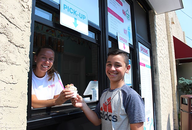 Grab your ice cream to go from the takeout window or snag one of the limited outdoor tables.