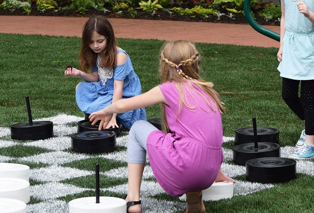 Kids can enjoy a game of lawn checkers on the grass-like surface.