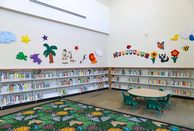 This library is on the smaller side, but that doesn't really matter because the children's wing is large, with an excellent open play space. There's a large armchair for storytime, lots of great toys, puzzles, and a few computers perfect for toddlers and up. The branch offers normal children's programming including storytime for different ages, but a bigger draw is special parent/child programming, including events like Mother Daughter Tea or Adult Coloring and Spa Day. All events are free and include food, beverages, supplies, and sometimes even a goodie bag.