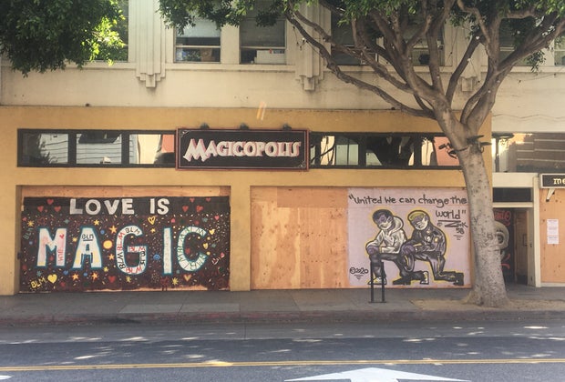 It's hard to know how long the artwork will be up in front of the boarded up businesses of Santa Monica's looted 4th Street, but the one in front of Magicopolis (the theater that runs all magic shows all the time at 1418 4th Street) is worth seeking out for a photo to remember the historic demonstrations of May and June 2020—and the love that helps to heal all.