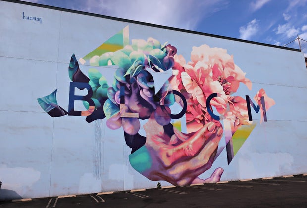 Covering an entire wall in the DTLA neigborhood known as Joel Bloom Square is a beautiful mural by artist Hueman called "Bloom" (701 E. 3rd St.). The painting shows a hand clutching a colorful bouquet of flowers. My daughters say it just gives them good vibes.
