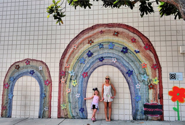 How about getting your child to pose under a pint-size rainbow alongside other happy little things? The "Rainbows Wall" (8050 Melrose Ave) features two crochet rainbows—one big and one small—as well as a peace sign and a patch of flowers.