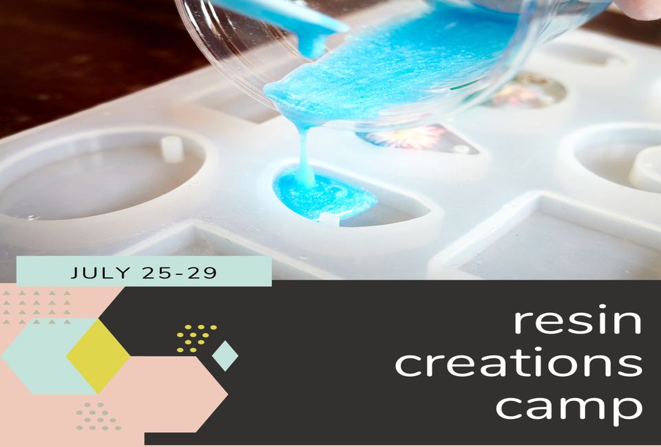 Campers explore how to use different types of resin with different media, like paint, alcohol inks, and various colorings and additives, as well as several pour techniques.