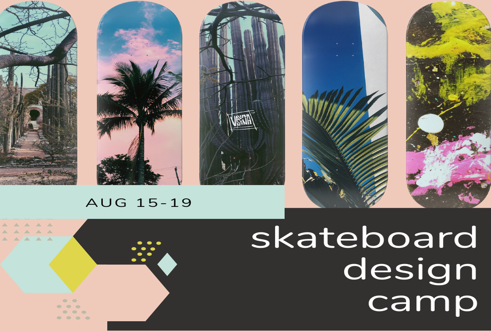 Kids in this camp learn the art and physics of skateboard design as they create and apply graphics onto their skateboard deck, then learn how to apply grip tape and mount the trucks and wheels. Campers use CAD software to help design logos for their skate brand and transfer the design onto t-shirts, stickers, and more. The creations are tested with mini skate lessons.