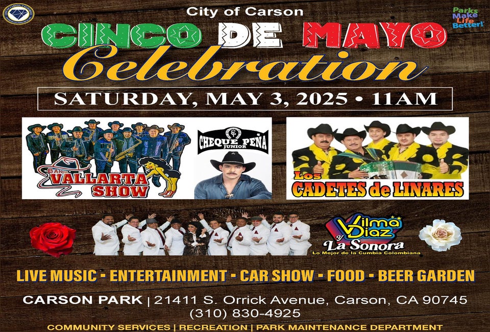 Carson's Cinco de Mayo Celebration features live music by Banda Vallarta Show, Los Cadetes de Linares, Cheque Peña Junior, and Vilma Diaz y La Sonora.