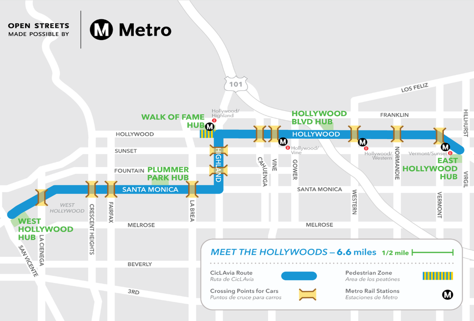 The 6.6 mile route connects event hubs at West Hollywood, Plummer Park, the Walk of Fame, Hollywood Boulevard and East Hollywood offering safe, car-free streets.
