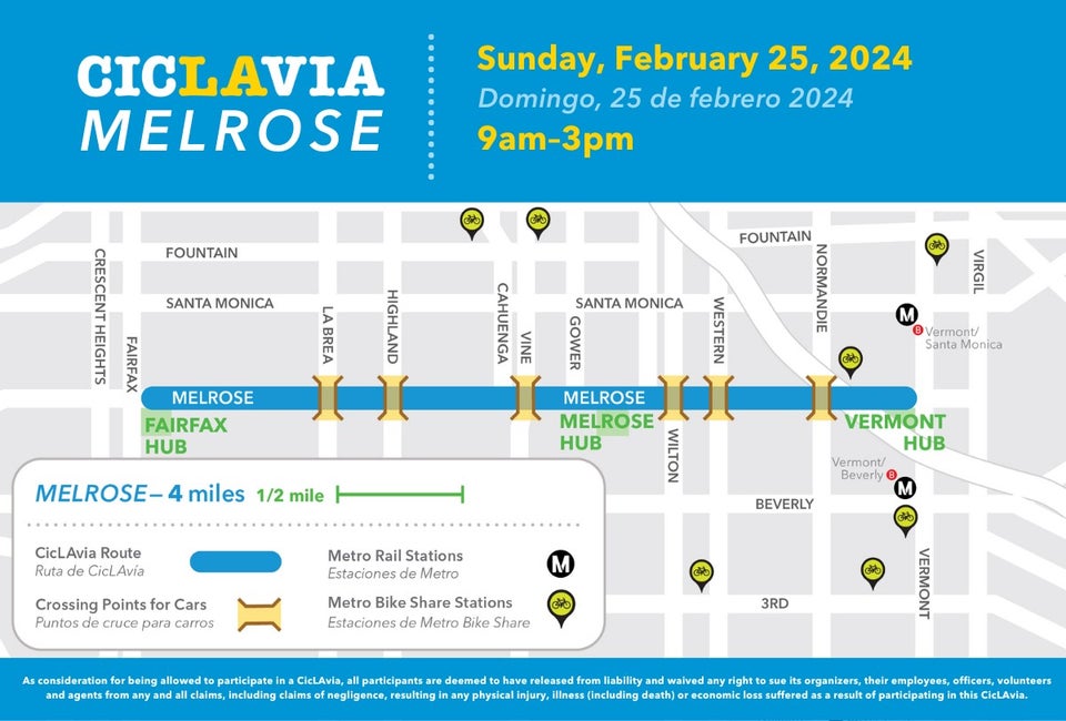 CicLAvia celebrates its 50th event with a 4-mile car-free route along Melrose Avenue, extending from Fairfax to Vermont.