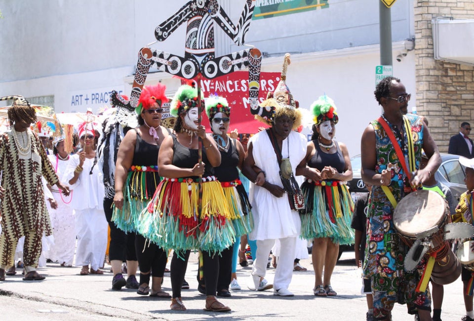 The annual Day of the Ancestors: Festival of Masks is a daylong event of mask making, life-sized puppets, art, food, music, and the discovery of the African history and culture of the surrounding communities of Leimert Park.