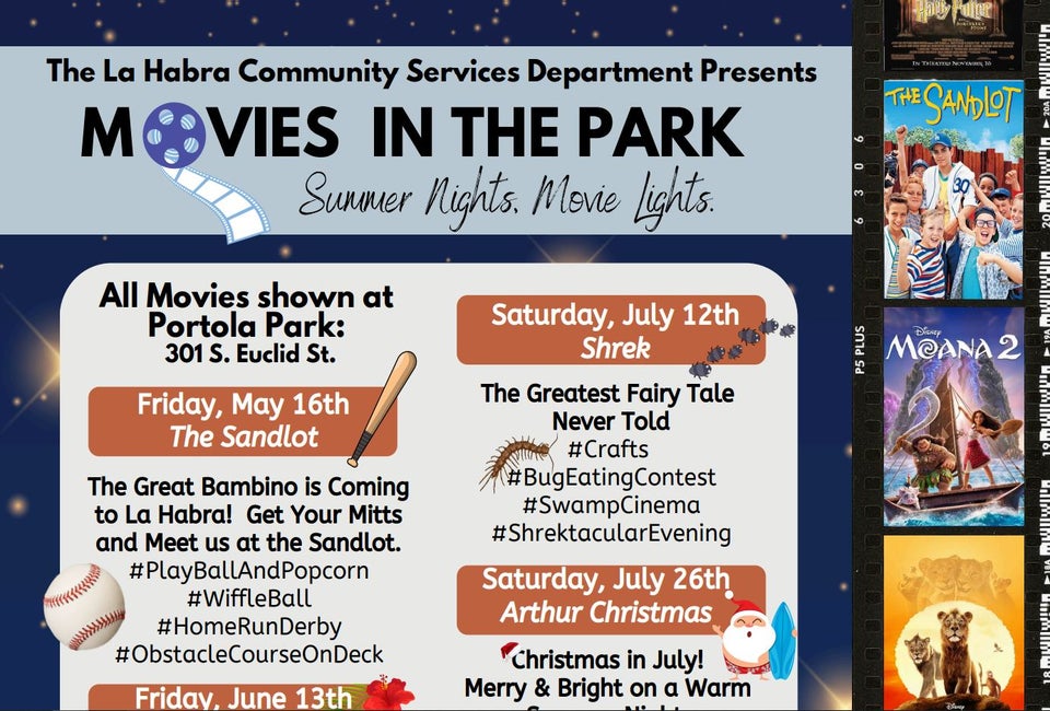 The city of La Habra shows free movies this summer at different parks. This season's highlights include recent releases such as Moana 2 and Mufasa, alongside classics such as Shrek and Harry Potter