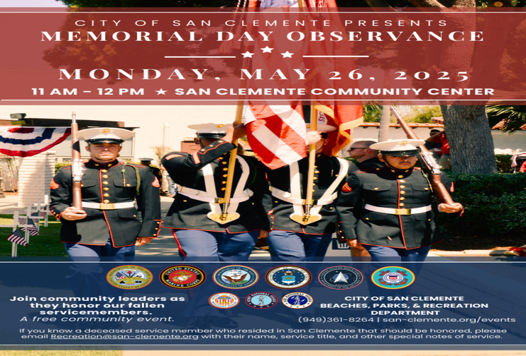 San Clemente's 2025 Memorial Day program features a keynote speaker, the presentation of wreaths and florals, the posting of the colors, taps bugler, and live music.
