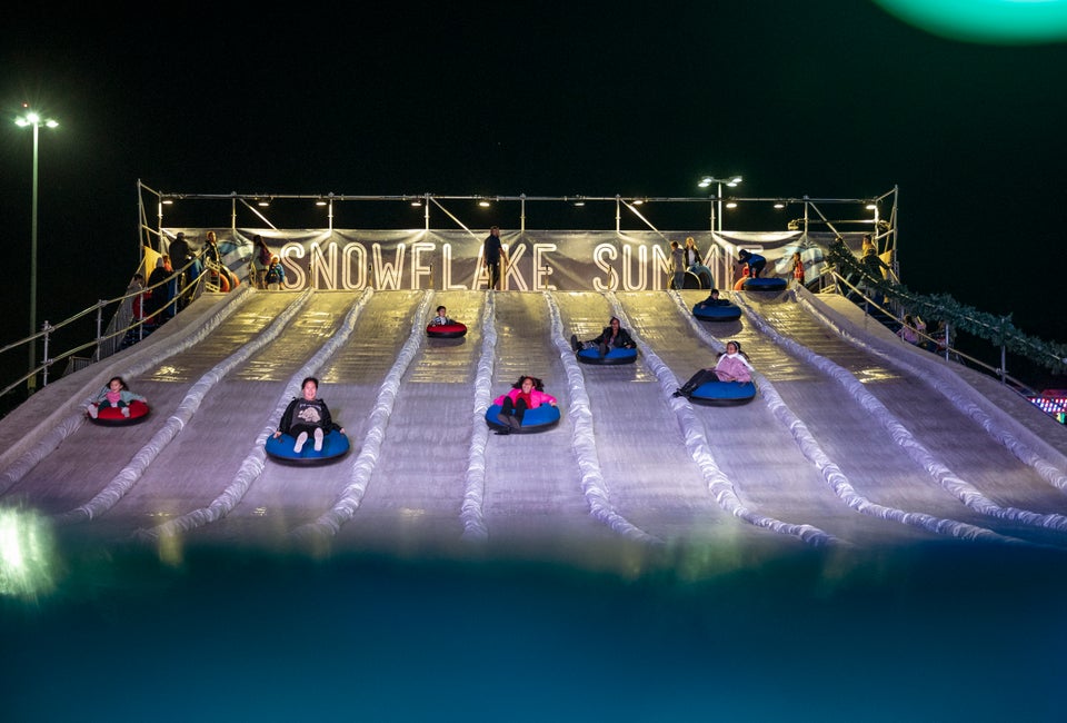 General admission includes unlimited ice tube rides, real snow play, immersive walk-through experiences, entertainment, light displays, and photo ops.