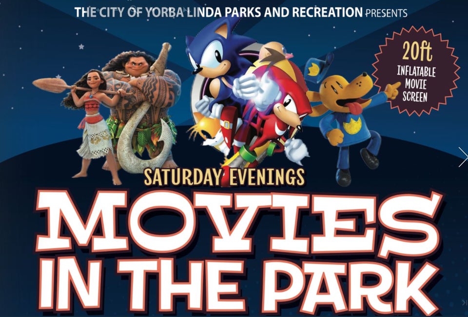 Yorba Linda hosts free monthly movies in the park shown on a giant inflatable screen.