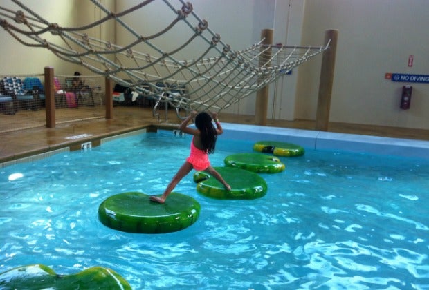 The focal point of any Great Wolf Lodge (and the thing that has had my Pennsylvanian niece telling me about this place for years) is the year-round, indoor water park. Everyone has unlimited access to the many water slides, the wave pool, the sports pool, the obstacle course pool, the surfing pool, and the spray structure pool from 9am-9pm each day—including before and after checking in or out. The resort mantra is, "One night of stay, two days of play." And there are enough water attractions to keep a family busy for at least two days. There are slides of varying speeds and centrifugal force that put the whole family in one raft; there are racing slides for individuals; there is a crazy vertical slide where the floor drops out and the rider is propelled like Augustus Gloop shooting through the chocolate pipe (can you tell I didn't try that one?); and there is a boogie-boarding slide on which riders can surf against the current for as long as they can ride the wave.