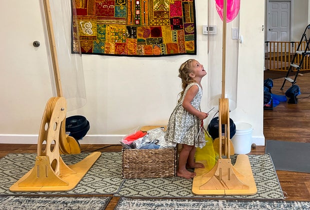 Within minutes, my five-year-old had taken a rubber track and stacked it up on ladders, stools, and bean bags to create a ball track. My eight-year-old plugged in multiple portable fans and experimented with wind as he blew scarves through the air. My three-year-old was stacking cork blocks and watching them fall. I watched the staff expertly rearrange materials when kids left them behind so there was “something new” to explore when they ran by again.
