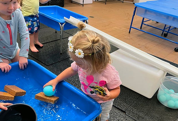 The kids donned wetsuits outside the gated area covered in non-slip tile and rubber mats. Dog-leg spigots in the wall dispensed lukewarm water at the touch of a lever, and it’s okay to spill, splash, and experiment in this water lab. My daughter grabbed a plastic turtle and several cups and bowls, while other kids poured water down pieces of plastic rain gutter. There was a lot of pouring, splashing, and playing followed by tons of giggles, and truthfully, I had to drag my 18-month-old out (sopping wet, I might add).