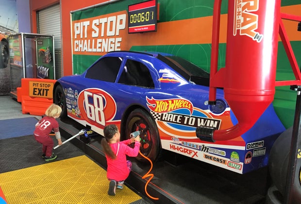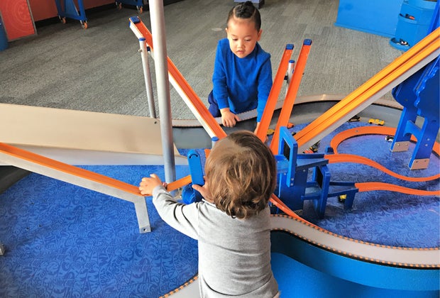 Several stations within the four zones invite parents and children to experiment with the cars' speed and performance while playing: at the way-cool six-lane downhill track, participants are challenged to figure out how to reach the finish line first, while at the intriguing adjustable angles track little engineers pick the right car to use and then adjust the tracks for optimum velocity. There's also a zoomy booster power track and a speed-timing track to see how lightening reflexes and perfect timing are the elements to make a car go fast and avoid collision. We couldn’t get our two-year-old to leave these stations; he tested every track and any Hot Wheel machine he could get his little hands on (and, trust me, there were so many!).